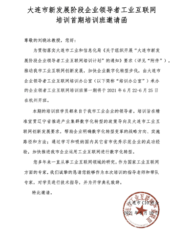 为推动我市工业互联网创新发展,加快企业数字化转型步伐,由大连市工业和信息化局、大连市工商业联合会、大连市企业联合会、大连市工业互联网产业联盟、大连市5G产业联盟等单位共同组建了大连市企业领导者工业互联网培训办公室,推出“大连市新发展阶段企业领导者工业互联网培训计划”,培训班第一期于2021年6月22-25日在杭州开班。