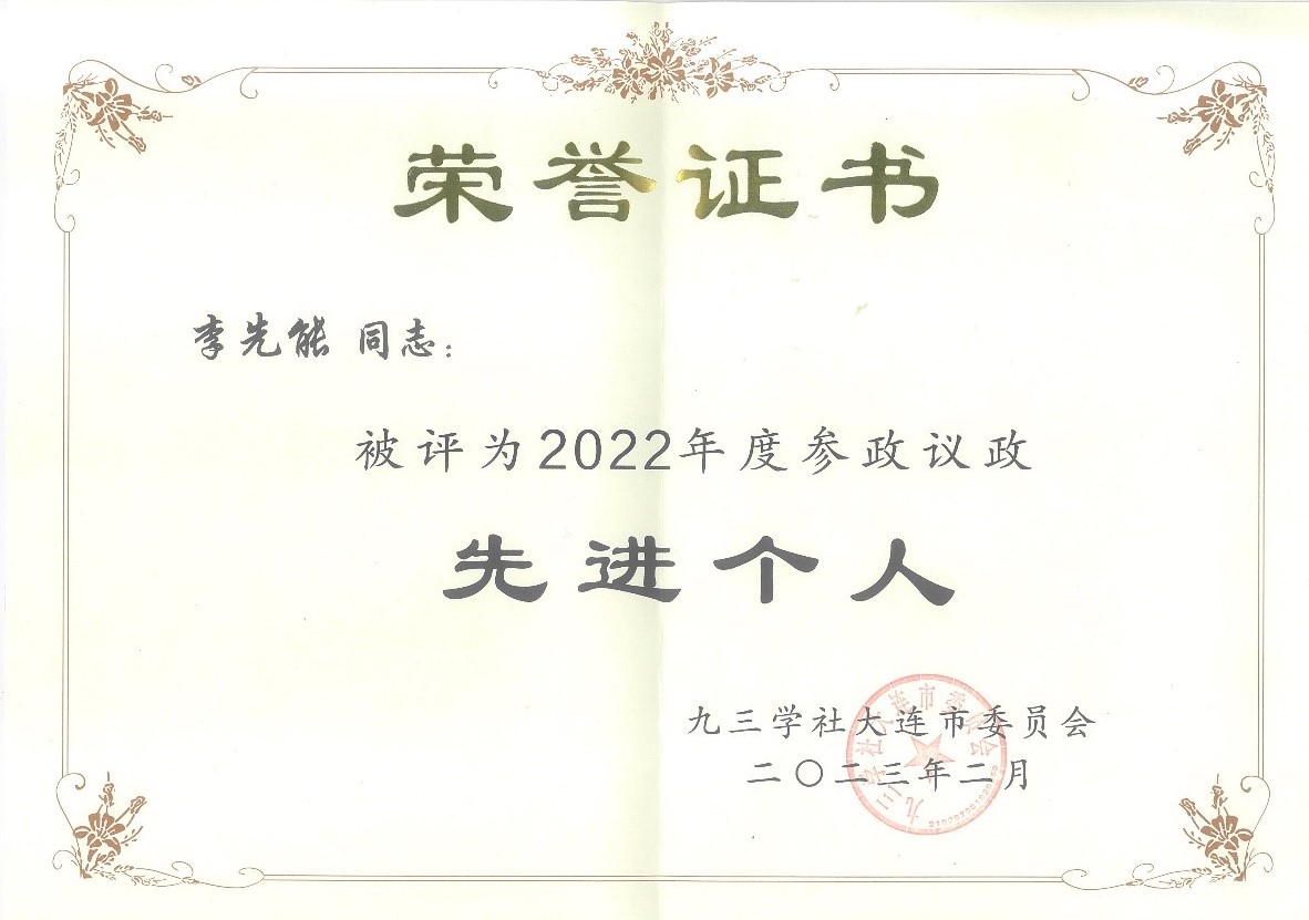 九三学社必发9988集团委员会被评为2022年度组织建设先进集体。社员李先能被评为2022年度参政议政先进个人。